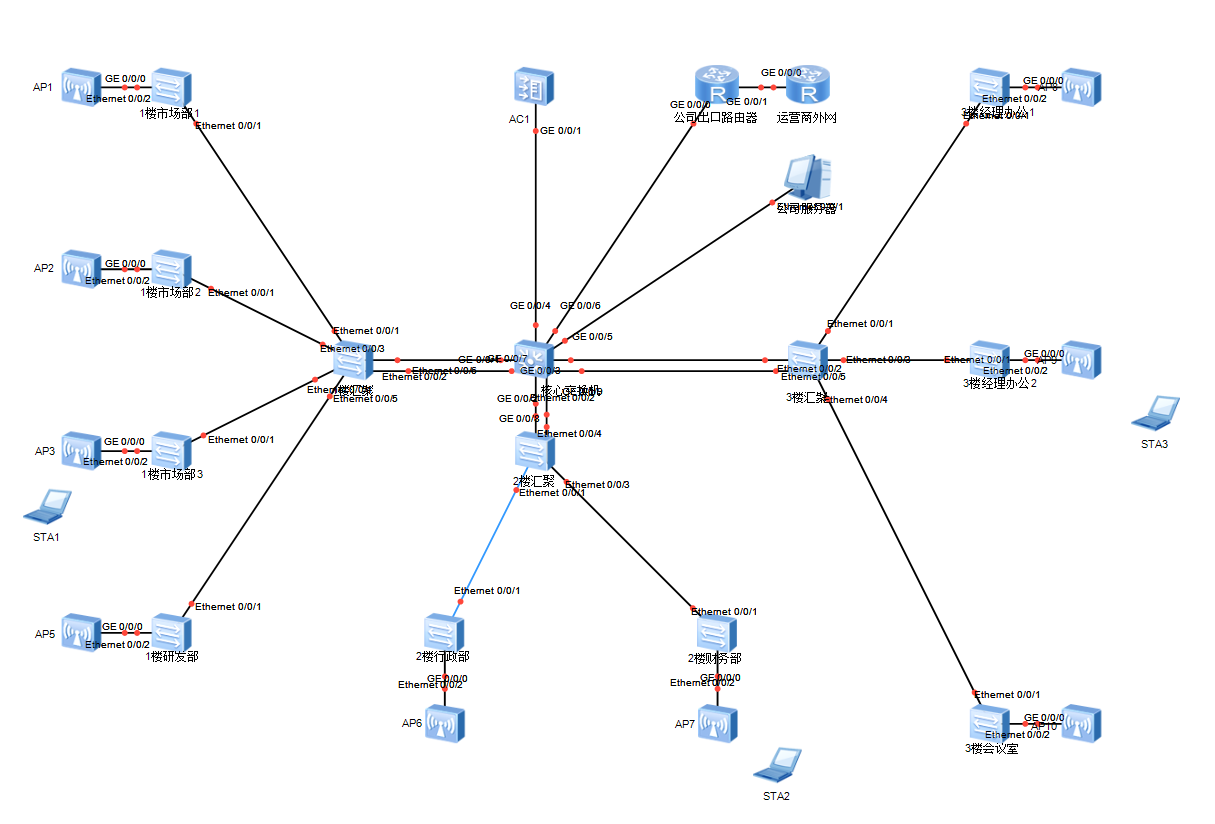 1、每个楼层部署网络设备间,2楼设置核心机房,部署服务器等。