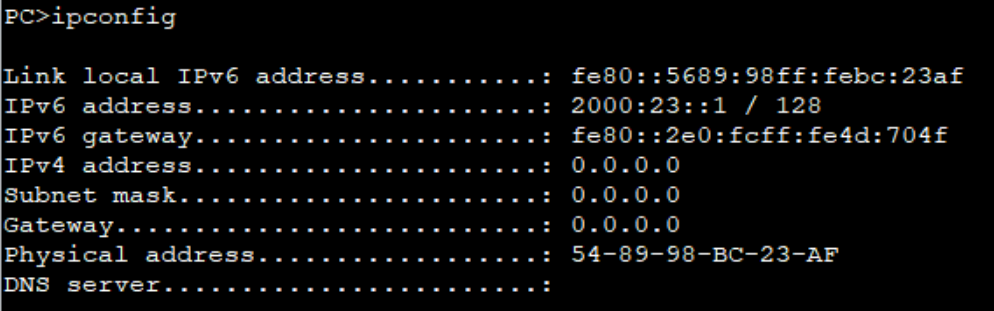 ipv6 add 2000:23::2 64启用DHCPv6服务器并在PC1上获取IPv6地址